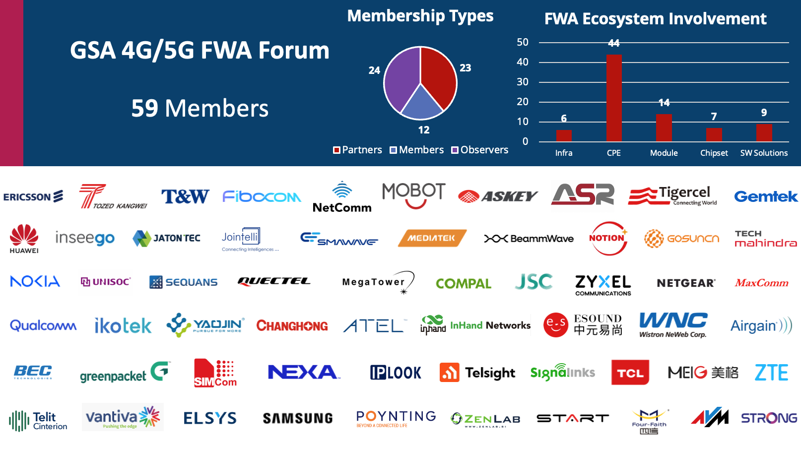 The GSA 4G-5G FWA Forum now counts more than 50 vendors among its membership, covering the majority of the infrastructure, chipset, module, software and CPE value chain for FWA.